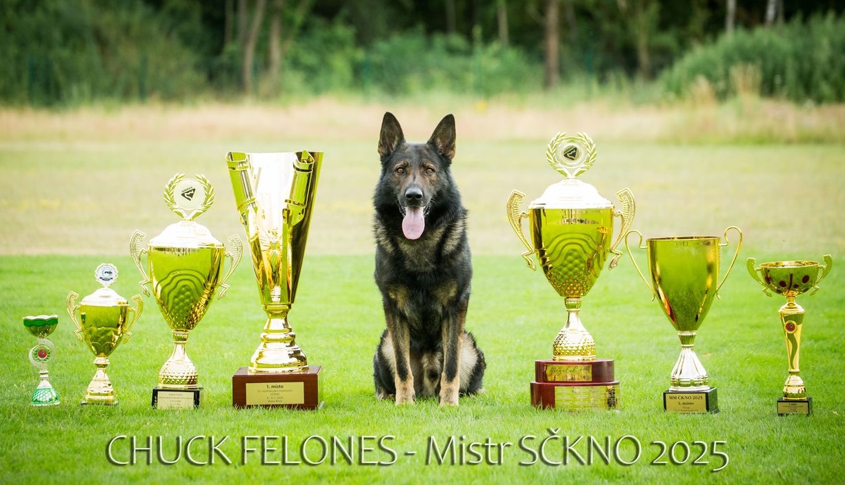Rodiče jsou zdraví, otec IGP3 Chuck Felones je úspěšný závodní pes, 2x vítěz MM SČKNO 2024 a 2025, 2. místo na mistrovství světa WUSV. HD/ED noormal.